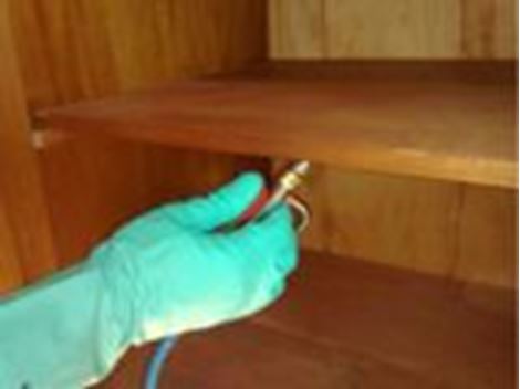 Injeção: Consiste na aplicação da calda cupinicida (saneantes) com auxilio de uma seringa diretamente em orifícios e frestas.